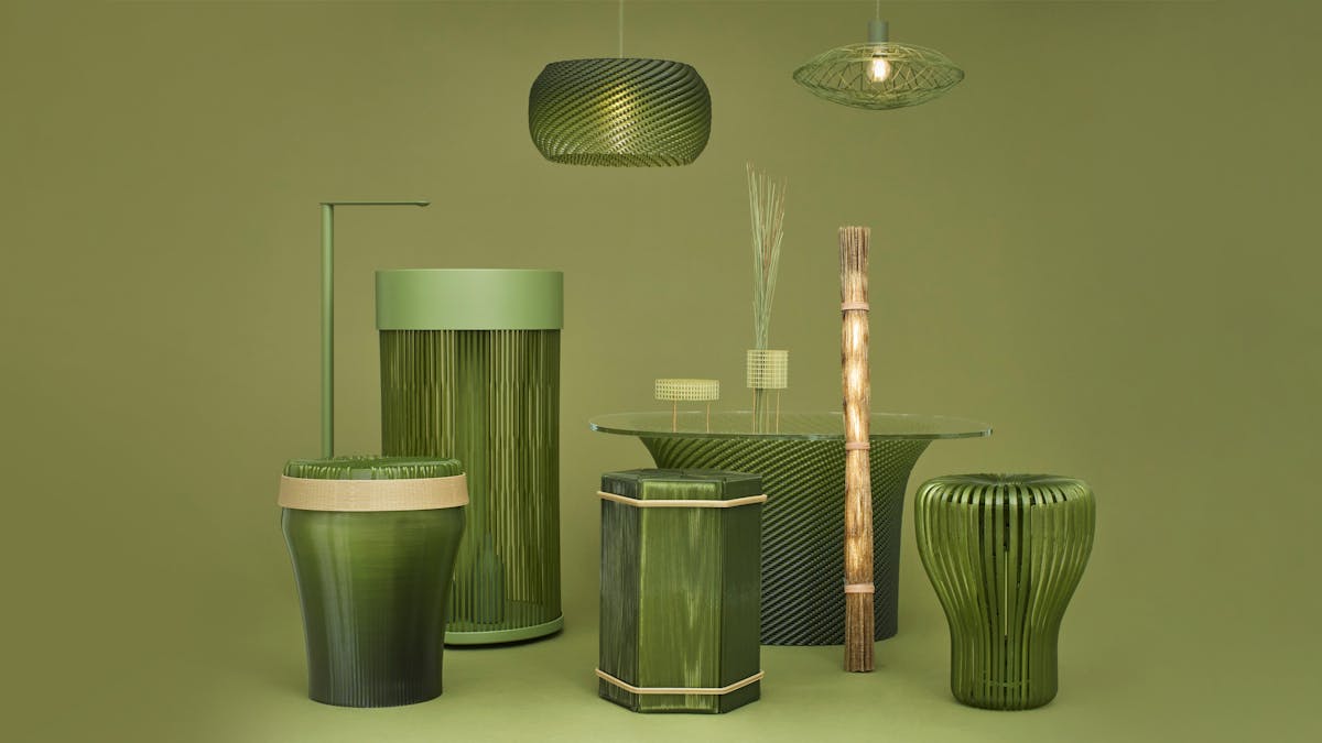 代表的な日本文化の1つである畳に樹脂を混錬することで畳の良さである「い草の匂い」を残しつつ、「防水性」を付加。さらには「通気性」「弾力性」などの良さも残すため、ExtraBold 社が所有する大型3D プリンター「EXF-12」を活用し、射出成形では実現が難しい編み目や中空構造の家具を制作しました。最先端のテクノロジーを取り入れつつも、シンプルな形状と深みのあるグリーンを採用したことで、心地よい住空間を実現する仕上がりの家具になっています。